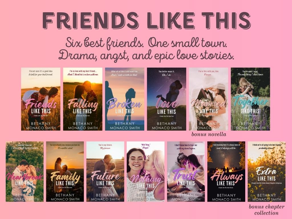 Friends Like This is a new adult romance/drama series following the lives and love stories of 6 best friends growing up in a small town together from ages 16-25. Each book in the series leads into the next even when POVs change, and must be read in order. The entire series is now complete and ready for binge reading! This series tackles a variety of mental health conditions/trauma and features late teens/college-aged characters in realistic and complicated stories.